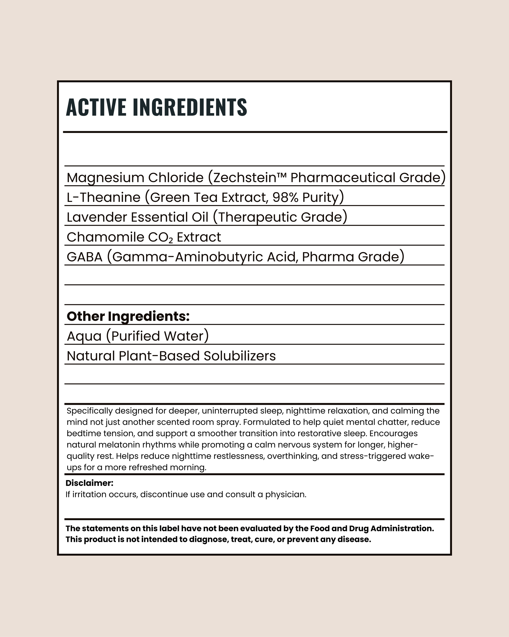 For external use only. Avoid contact with eyes and broken skin. If you are pregnant, breastfeeding, taking medication, or under medical supervision, please consult your healthcare provider before using this sleep spray. Discontinue use if irritation occurs. Keep out of sight and reach of children. Do not use if the seal is broken.